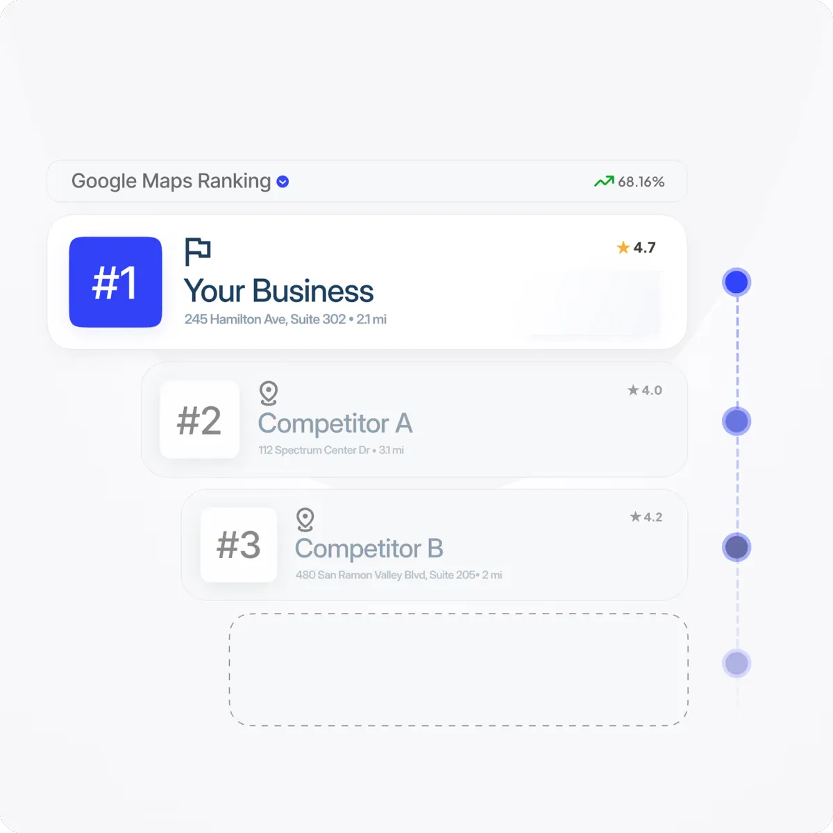 Rank in the top 3 positions on Google Maps for your most valuable keywords. Our AI-powered system gets you found by customers actively searching for your services right now.